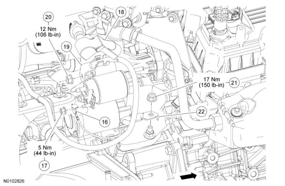 21. Remove the nut and position the battery cable engine ground terminal aside.