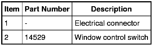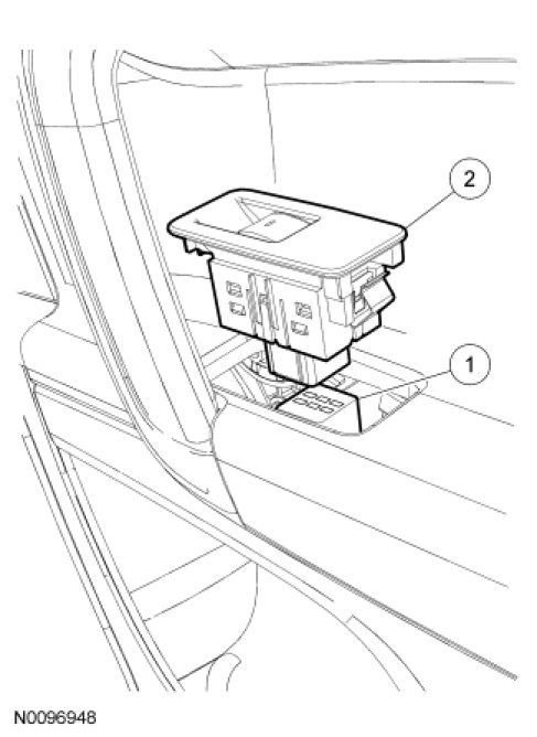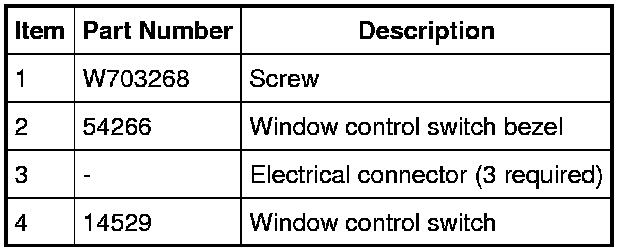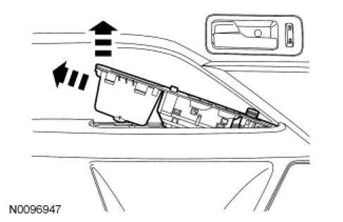 3. NOTE: For LH front window control switch assembly only, the rear retaining clip is located off-center towards the outside of the vehicle.