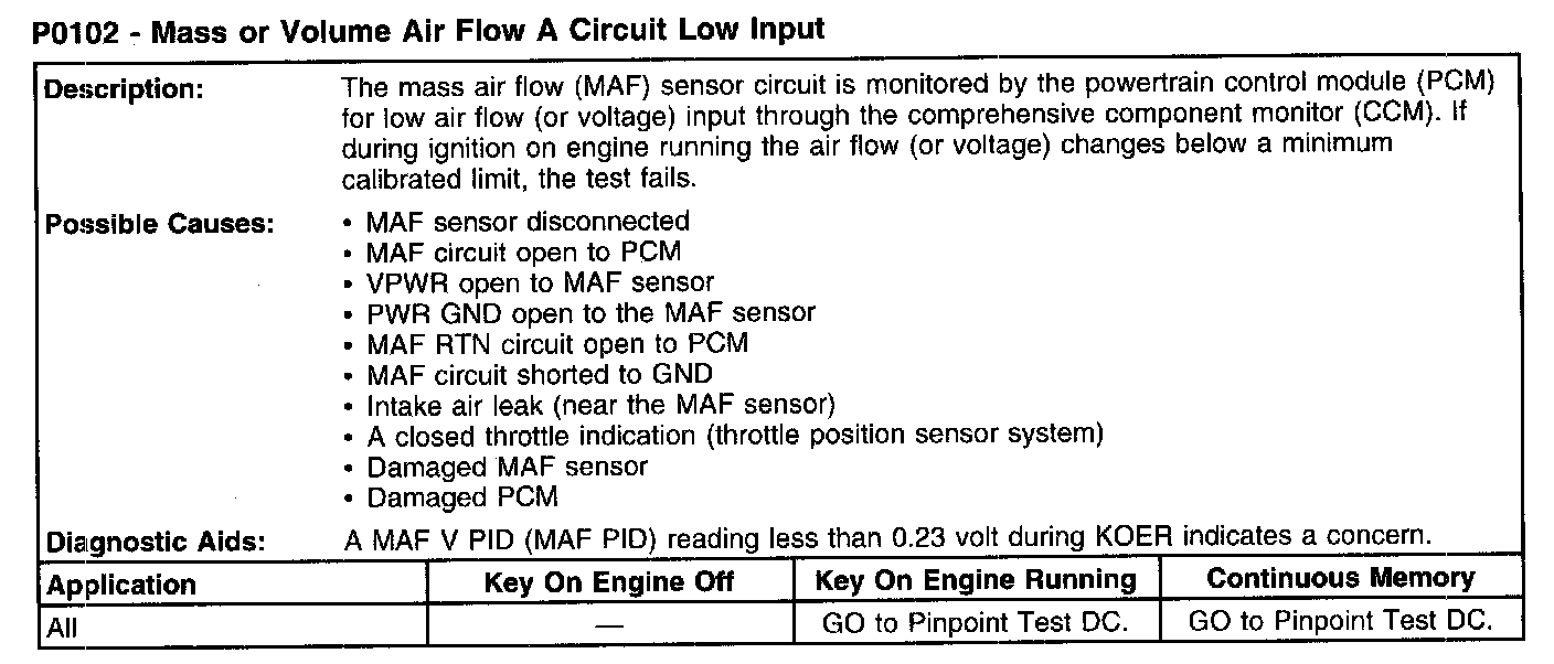 P0102 - Mass Or Volume Air Flow A Circuit Low Input: