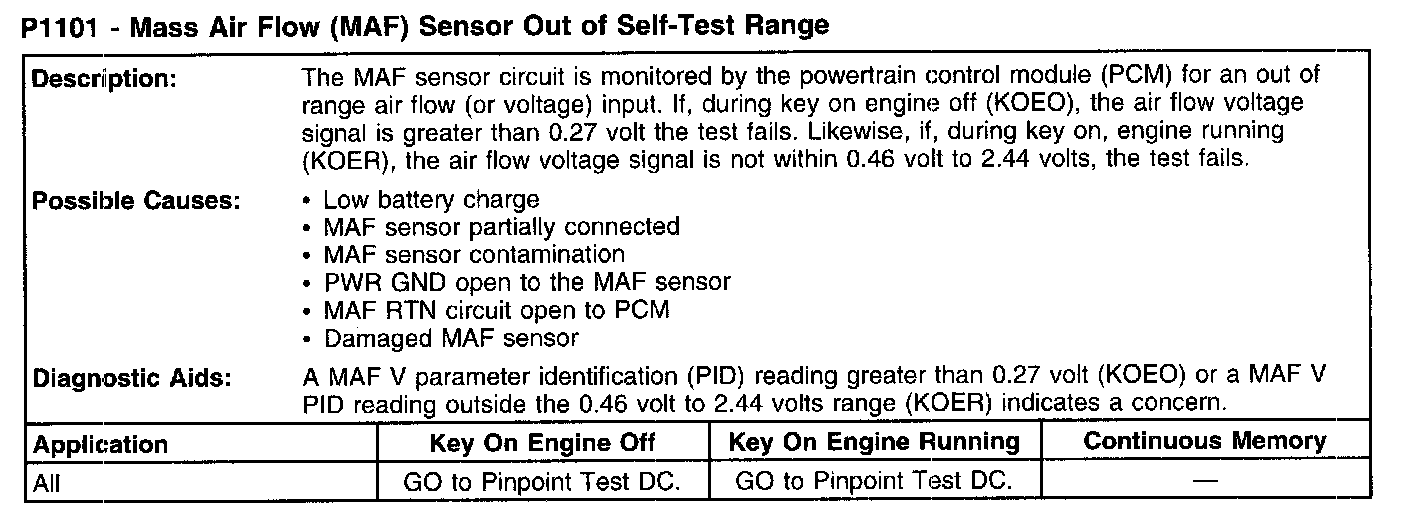 P1101 - Mass Air Flow (MAF) Sensor Out Of Self-Test Range: