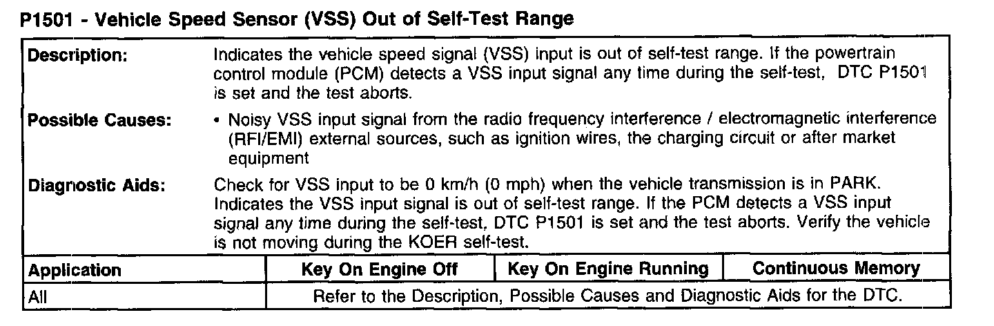 P1501 - Vehicle Speed Sensor (VSS) Out Of Self-Test Range: