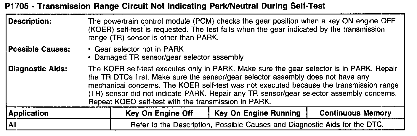 P1705 - Transmission Range Circuit Not Indicating Park/Neutral During Self-Test: