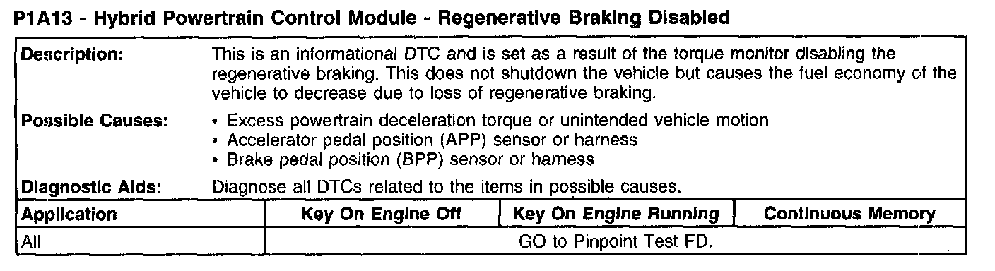 P1A13 - Hybrid Powertrain Control Module - Regenerative Braking Disabled: