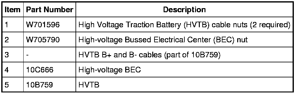 5. Remove the 2 HVTB cable nuts and detach the cables from the high-voltage Bussed Electrical Center (BEC).