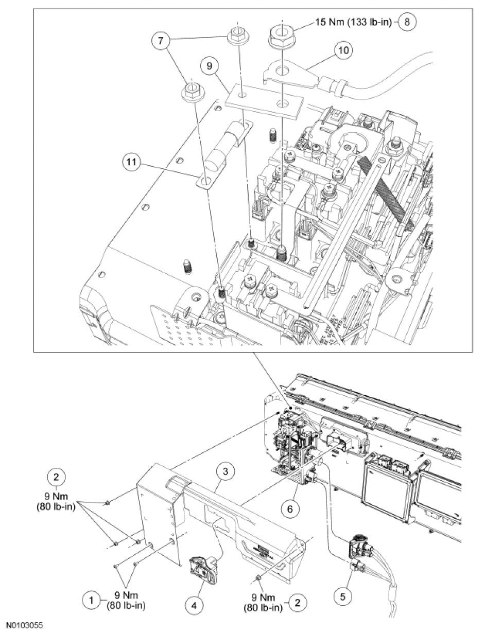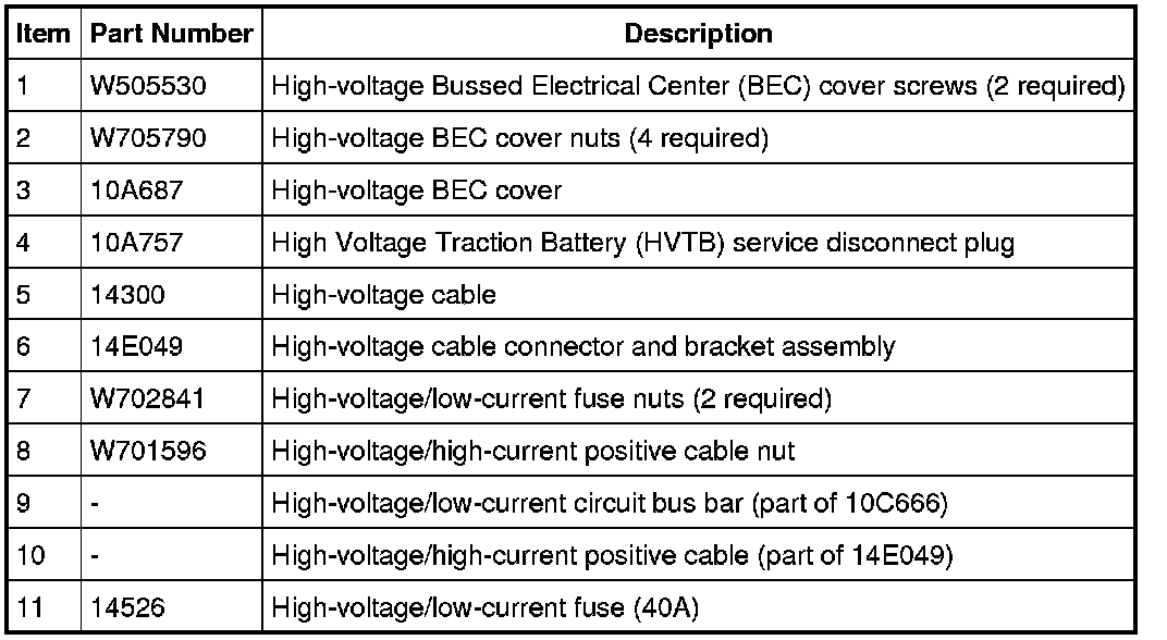 WARNING: Never install the service disconnect plug with the high-voltage bussed electrical center (BEC) cover removed. Always install the cover prior to connecting the service disconnect plug. The high-voltage BEC cover prevents inadvertent contact with the high voltage which is present at several points under the cover. Failure to follow these instructions may result in serious personal injury or death.