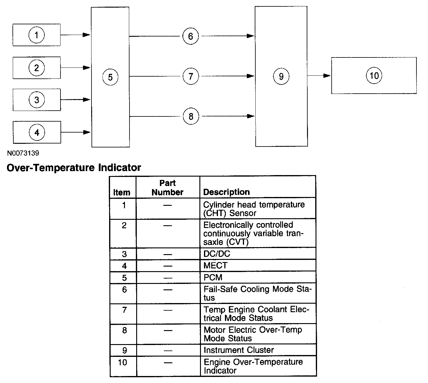 The powertrain control module (PCM) monitors the engine, the motor electronics coolant temperature (MECT), the DC/DC converter and the electronically controlled continuously variable transaxle (CVT) for an over-temperature condition. If either of the temperatures exceed their threshold value, the fail-safe cooling status changes status to ON, and the powertrain control module (PCM) broadcasts an over-temperature indicator on controller area network (CAN) message to the instrument cluster. The instrument cluster then illuminates the indicator. The indicator request shall also be made if the motor electronics coolant temperature sensor hardwire is detected as a shorted, high resistance or an open circuit. The over-temperature indicator is turned off when the temperature returns below the threshold value.
