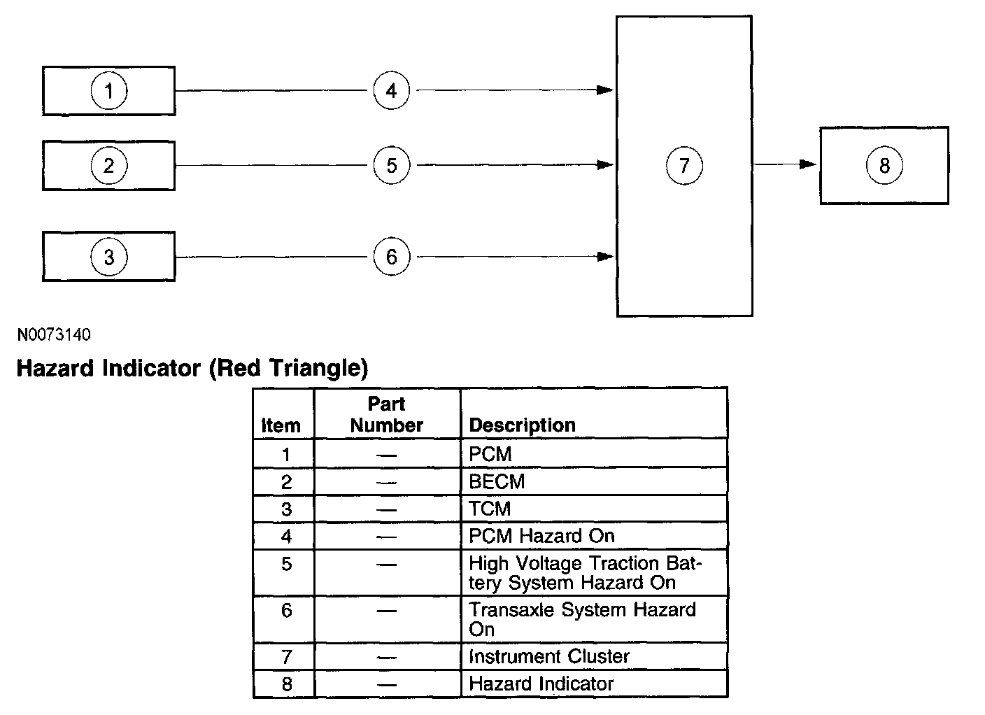 The hazard indicator illuminates whenever a severe concern within the hybrid electric system is detected and continued use of the vehicle is likely to cause damage to the system or to the vehicle. When the concern is present, the control module detects, sets the DTC and broadcasts a hazard on CAN message to the instrument cluster. Upon receiving the CAN message, the instrument cluster turns the indicator on.