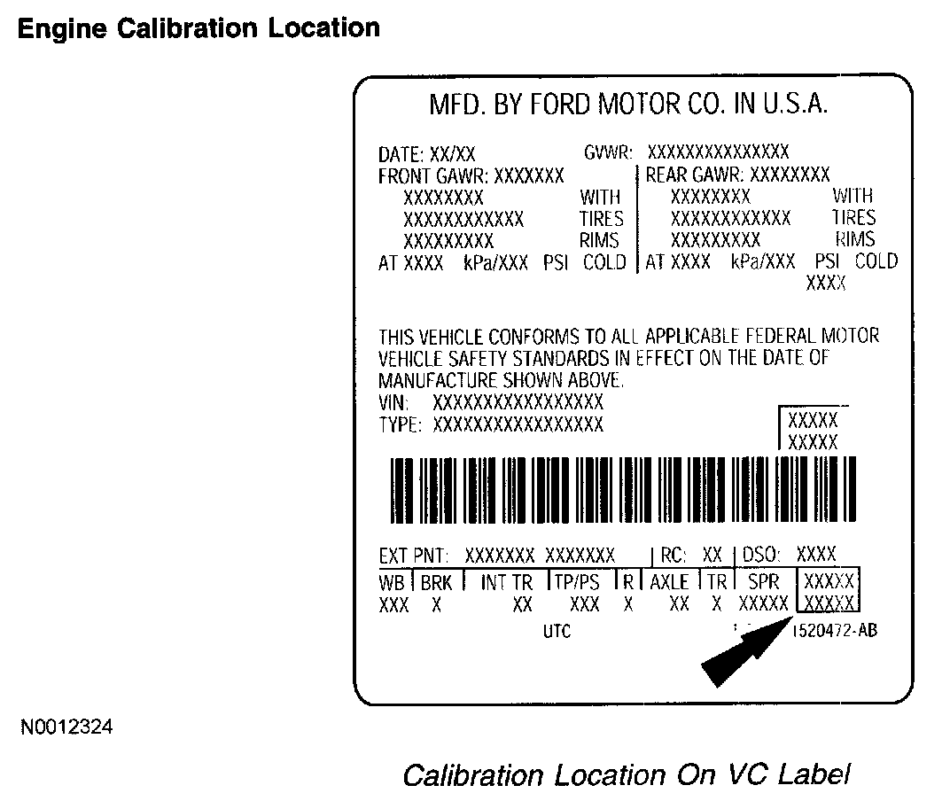 Base engine calibration information, also referred to as the powertrain calibration, is located in the lower right corner of the VC label. Engine calibration information is limited to a maximum of five characters per line (two lines maximum). Calibration information more than five characters long wraps to the second line of this field. Only the base calibration appears on this label. The revision level is no longer printed on the label; however, it can be found in On-line Automotive Service Information System (OASIS). For more information on VC label or engine calibration, refer to the Vehicle/Application and ID, Identification Codes.