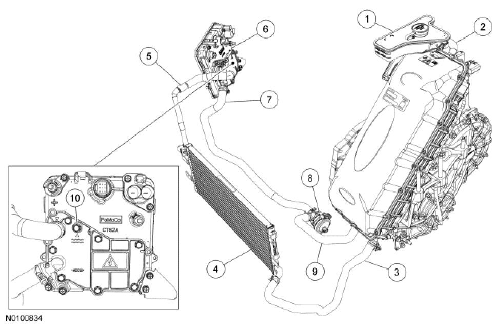 The vehicle uses a pump driven cooling system, referred to as the Motor Electronics Cooling System (MECS) pump, to transfer heat generated by the Electronically Controlled Continuously Variable Transmission (eCVT) and the Hybrid Electric Vehicle (HEV) DC/DC converter to the atmosphere. The system uses a coolant-to-air radiator design.