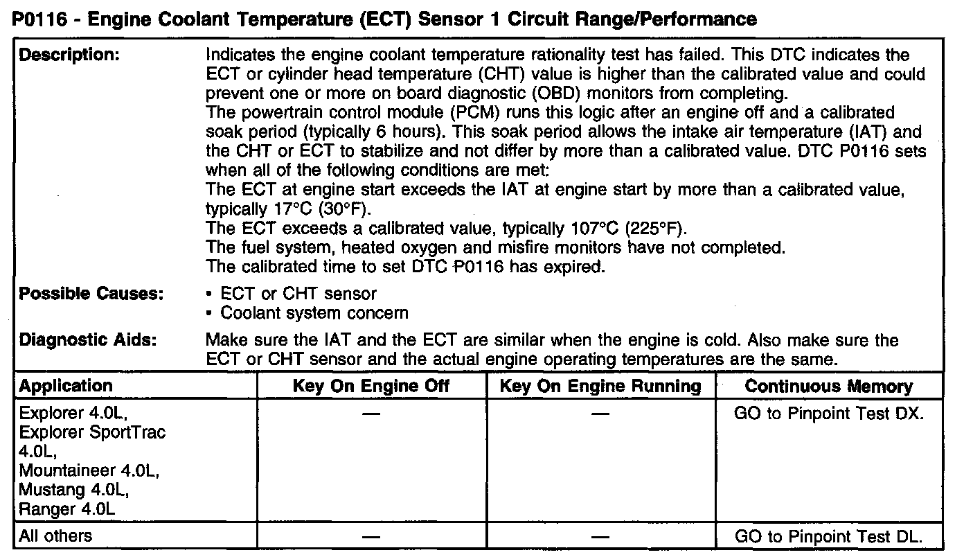 P0116 - Engine Coolant Temperature (ECT) Sensor 1 Circuit Range/Performance: