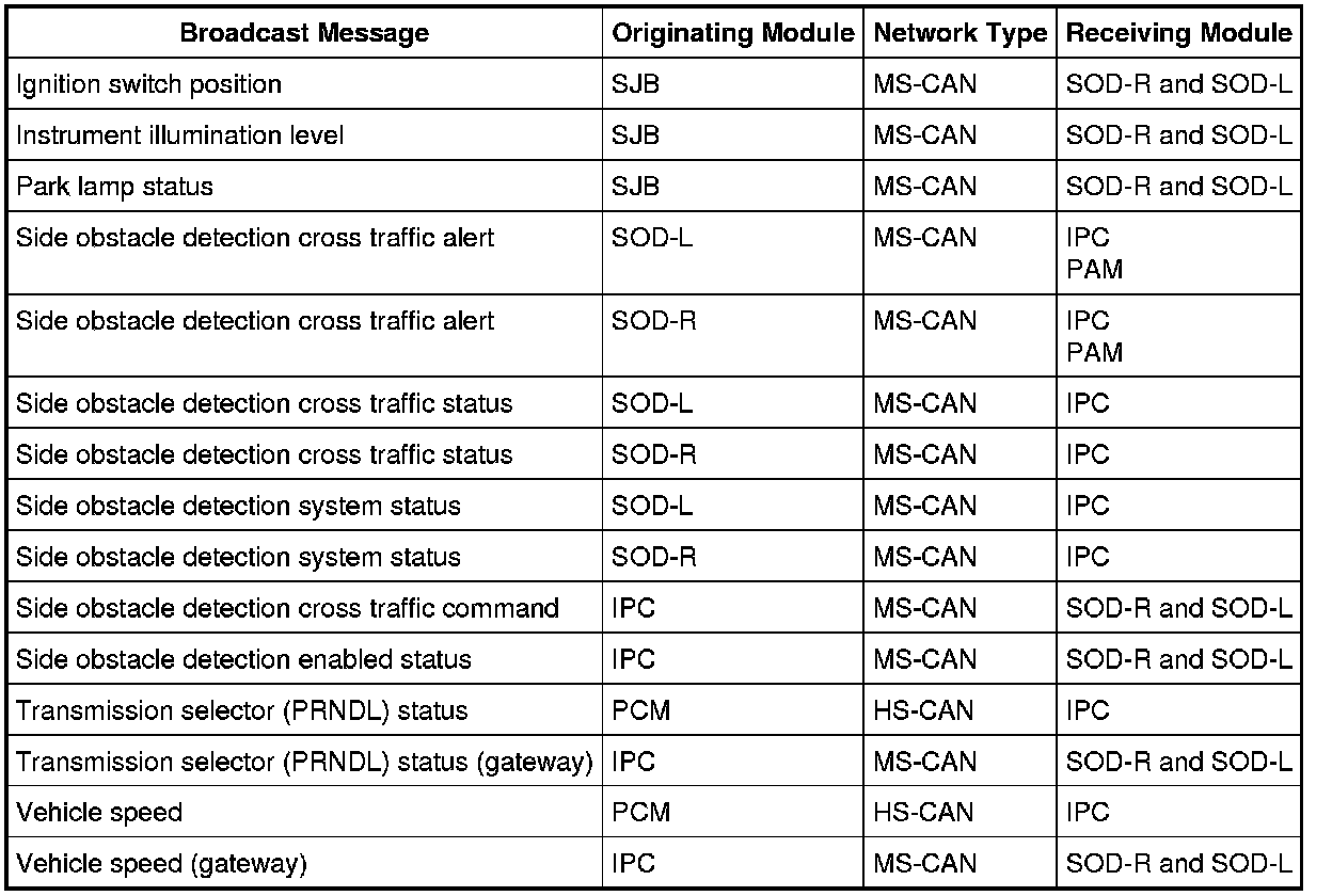 NOTE: The BLIS(TM) and CTA system both utilize the Side Obstacle Detection Control Module - Left (SOD-L), Side Obstacle Detection Control Module - Right (SOD-R) and the exterior mirror BLIS(TM)/CTA LEDs.