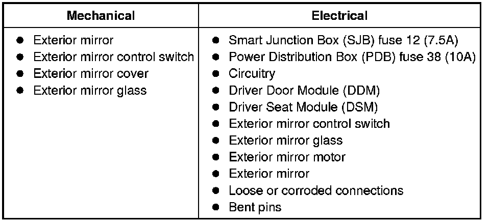 10. If no DTCs related to the concern are retrieved, GO to Symptom Chart - Exterior Mirrors or GO to Symptom Chart - NVH. Symptom Chart - Exterior Mirrors Symptom Chart - NVH
