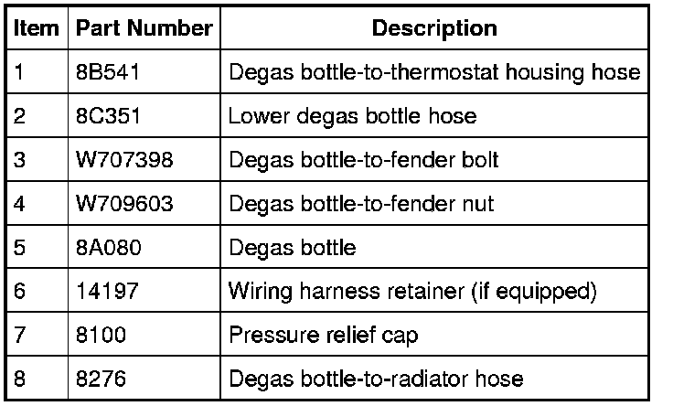 10. Fill the degas bottle. Refer to Cooling System Draining, Filling and Bleeding Service and Repair for the recommended coolant mixture and fill level.