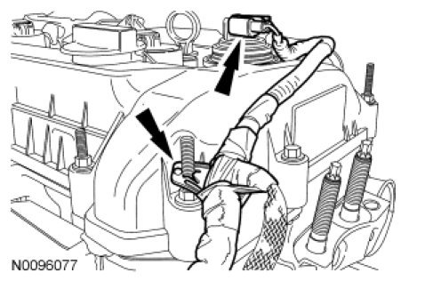 120. Connect the Variable Camshaft Timing (VCT) electrical connector and attach the wiring harness retainer to the valve cover stud bolt.