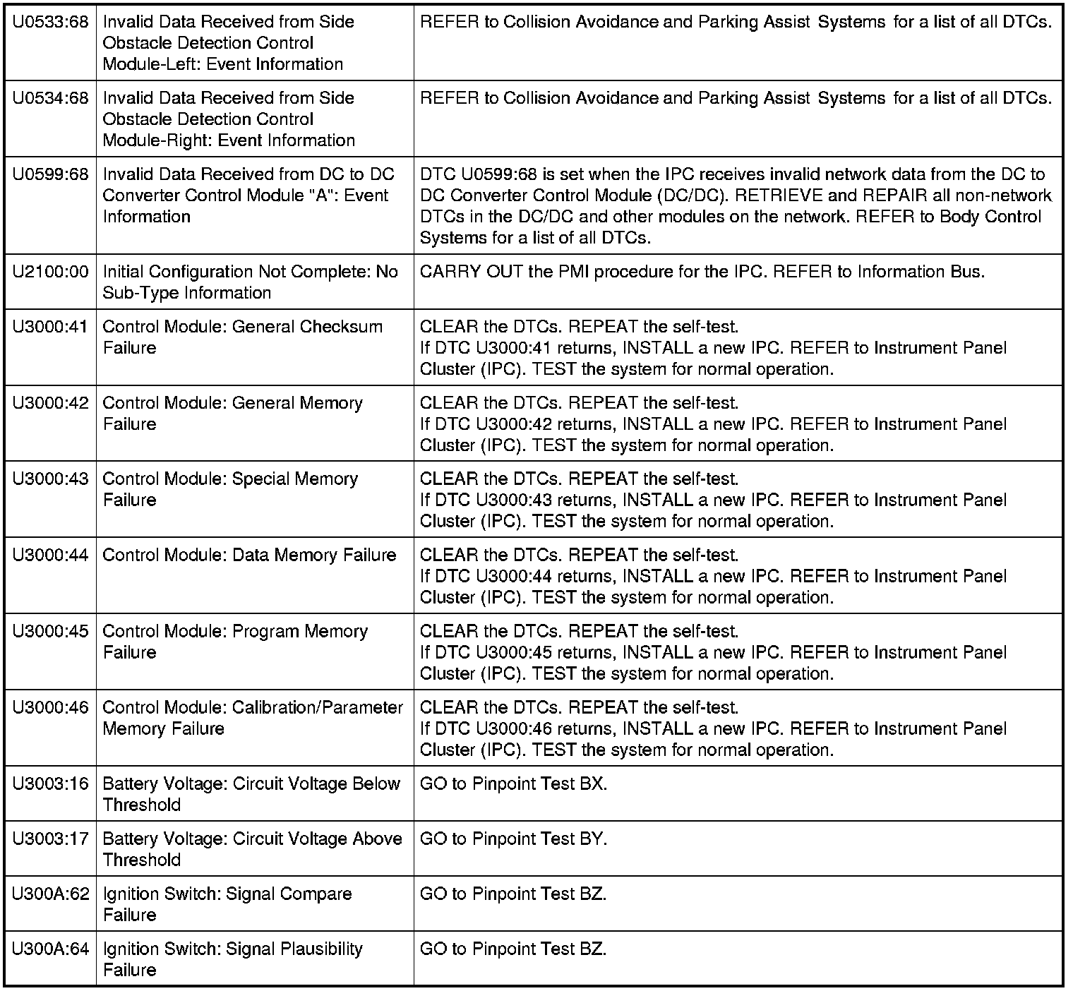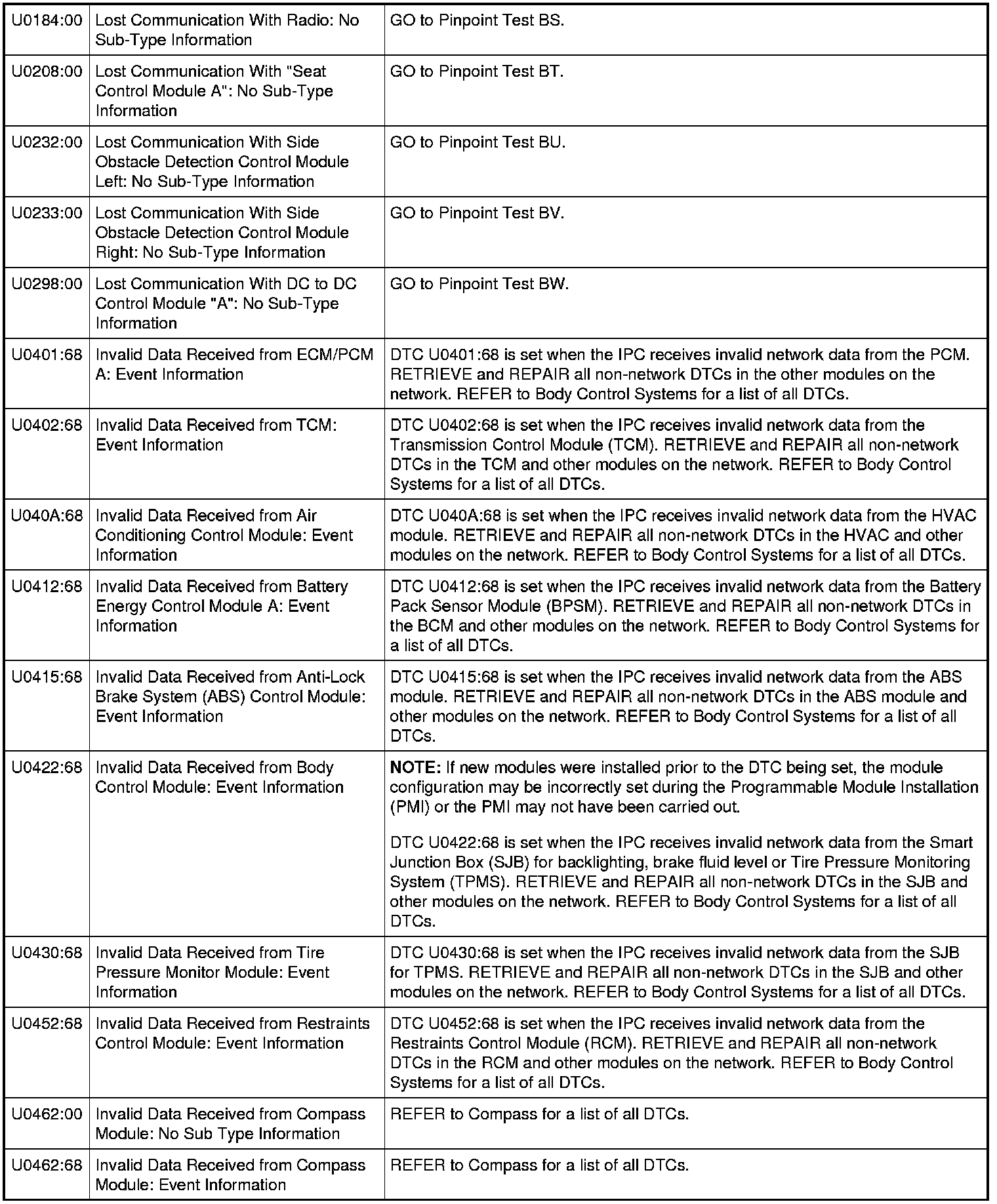 NOTE: This module utilizes a 5-character DTC followed by a 2-character failure-type code. The failure-type code provides information about specific fault conditions such as opens, or shorts to ground. Continuous memory DTCs have an additional 2-character DTC status code suffix to assist in determining DTC history.