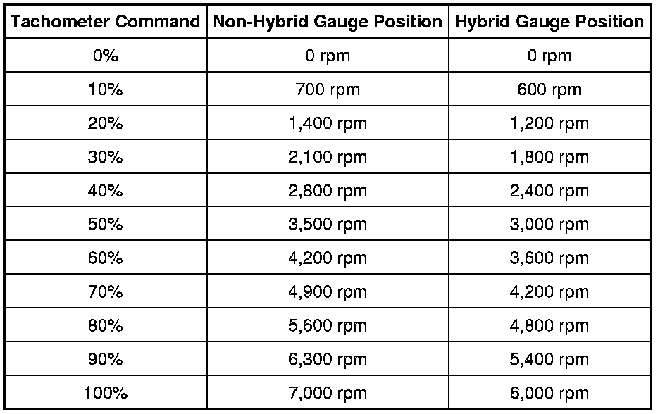 The hybrid requires two messages sent from the PCM to operate the tachometer. The first message is an engine active message indicating that the vehicle is in the gas engine operating mode. The second message required for the tachometer is the actual engine rpm data.