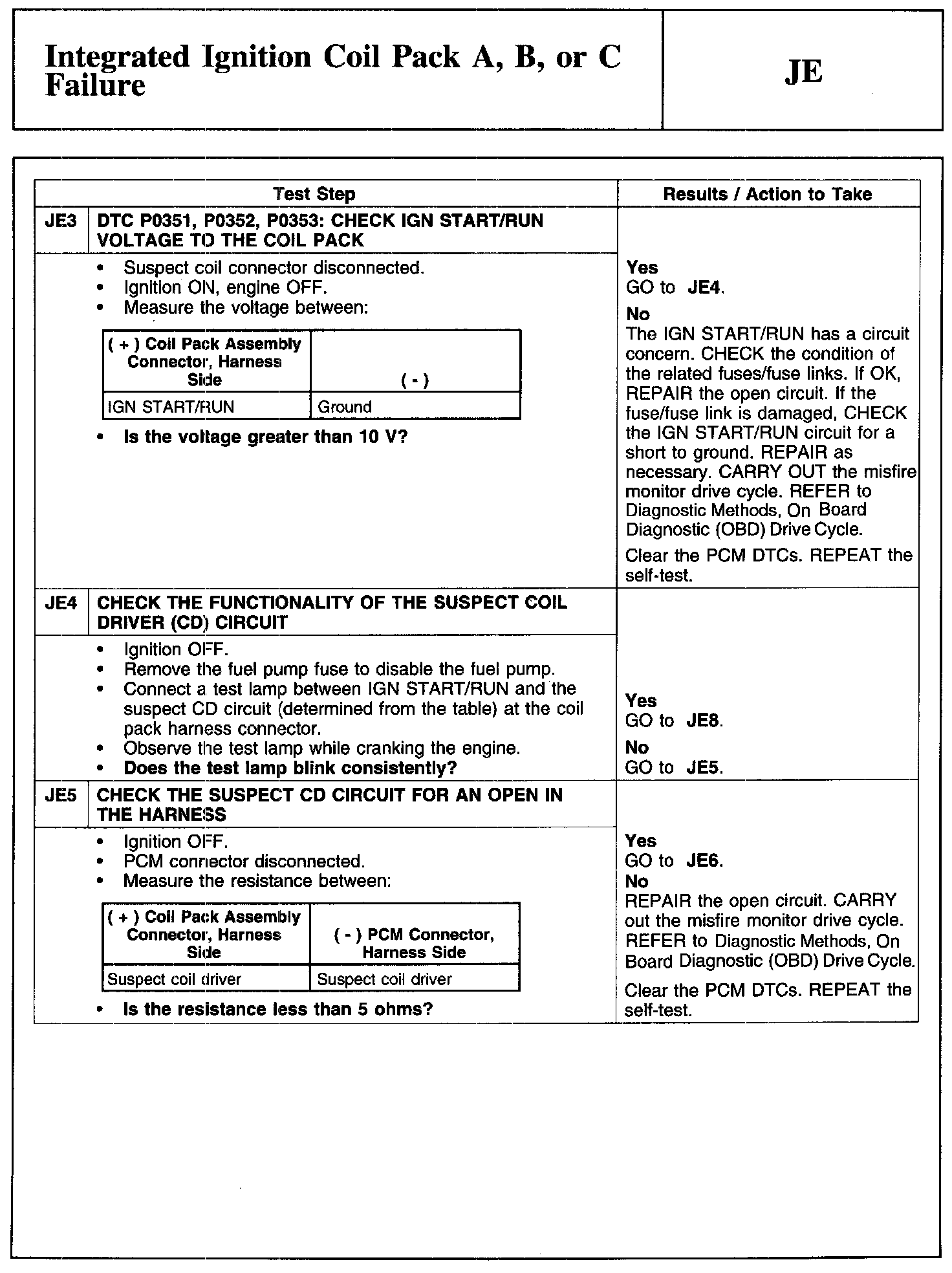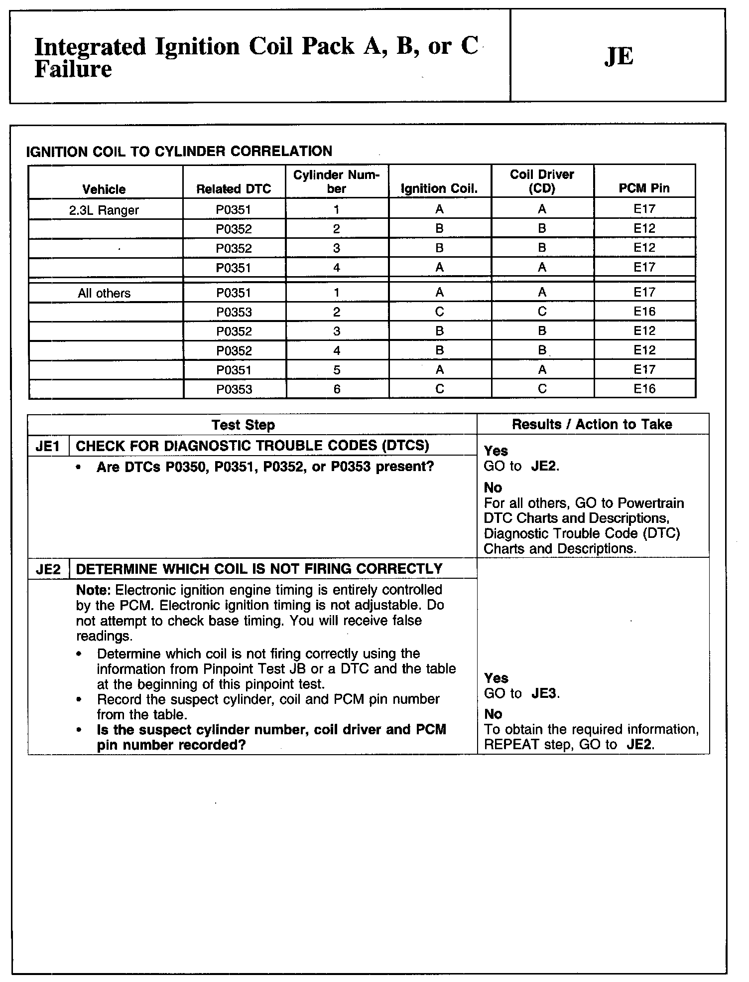 PINPOINT TEST JE: INTEGRATED IGNITION COIL PACK A, B, OR C FAILURE