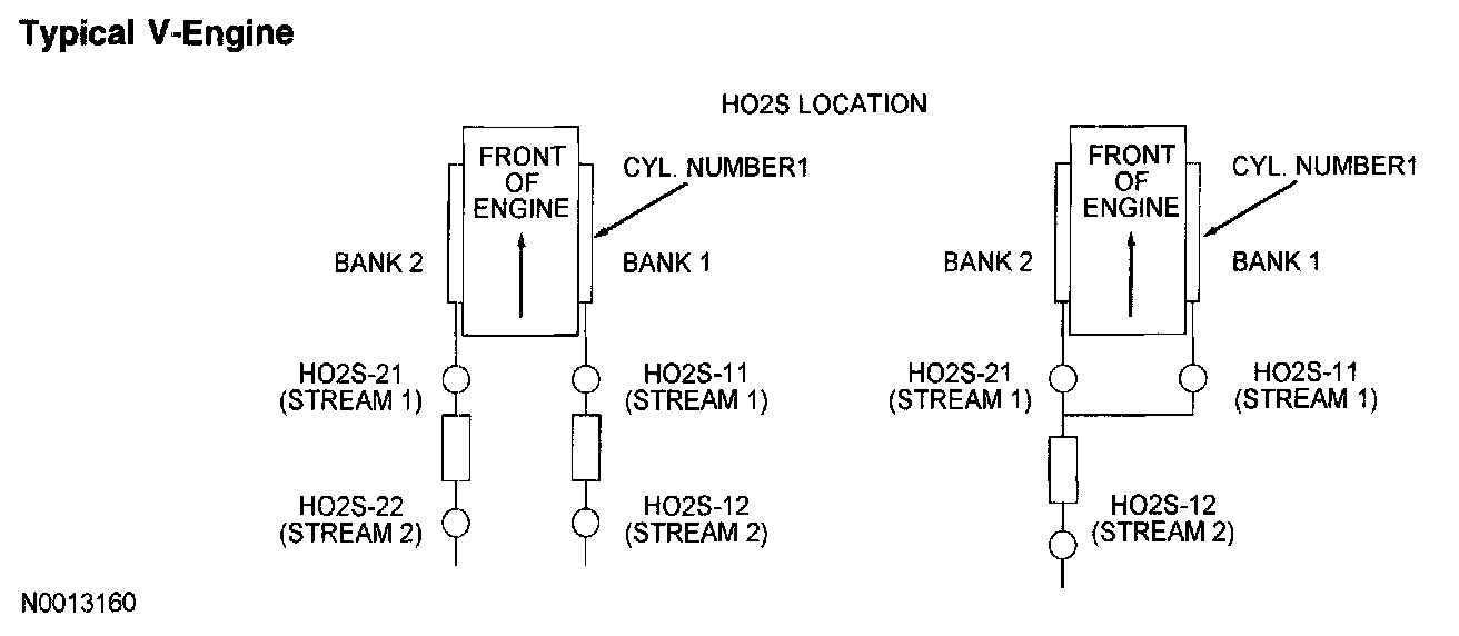 Only two HO2Ss are used in an exhaust stream. The front sensors (HO2S11/HO2S21) before the catalyst are used for primary fuel control while the sensors after the catalyst (HO2S12/HO2S22) are used to monitor catalyst efficiency.