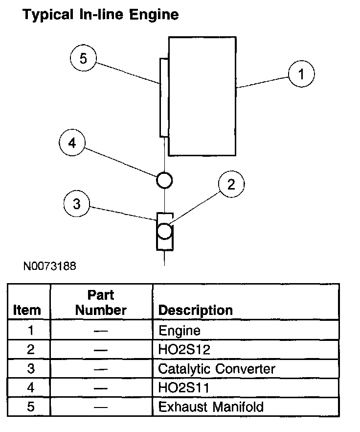 The exhaust system generally consists of an exhaust manifold, front exhaust pipe, front heated oxygen sensor (HO2S), rear exhaust pipe, catalyst HO2S, a muffler, and an exhaust tailpipe. The catalytic converter is typically installed between the front and rear exhaust pipes. On some vehicle applications, more than one catalyst is used between the front and rear exhaust pipes. Catalytic converter efficiency is monitored by the on board diagnostic (OBD) system strategy in the powertrain control module (PCM). For information on the OBD catalyst monitor, refer to the description for the Catalyst Efficiency Monitor. Catalyst Efficiency Monitor