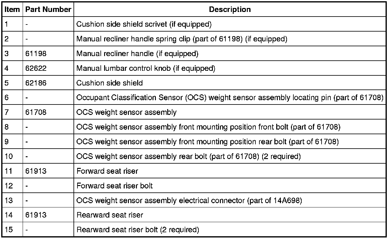 WARNING: Use care when handling the front passenger seat and track assembly. Dropping the assembly, placing excessive weight on or sitting on a front passenger seat that is not secured in the vehicle may result in damaged seat components. Failure to follow these instructions may result in incorrect operation of the occupant classification sensor (OCS) system and increases the risk of serious personal injury or death in a crash.