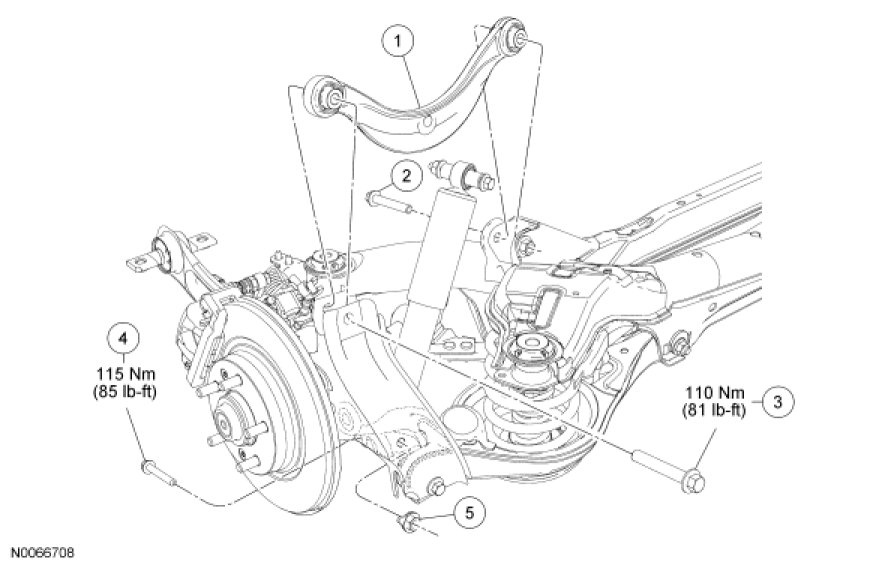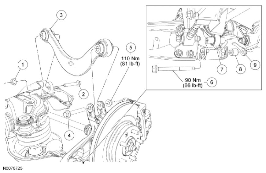 - To install, tighten the new nut and bolt to 110 Nm (81 lb-ft) with the suspension at the bushing fastener tightening position.