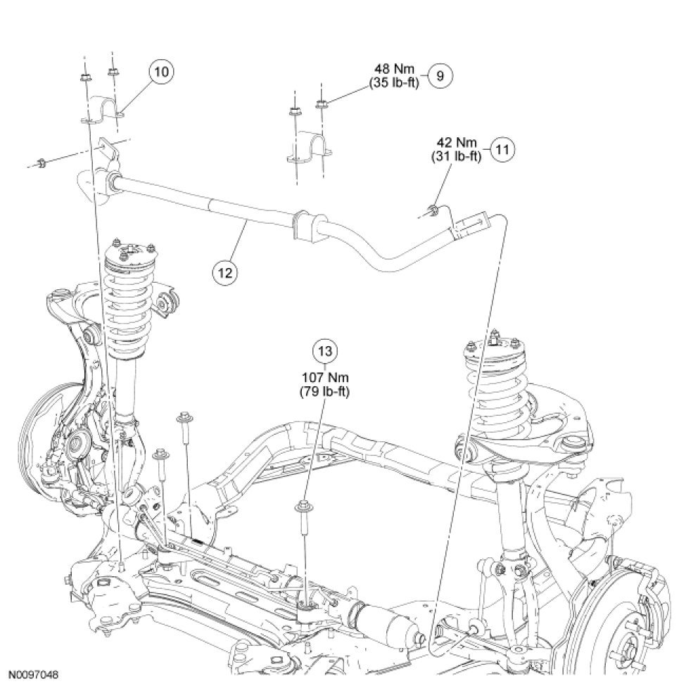 - To install, tighten the new nuts to 48 Nm (35 lb-ft) and install new cotter pins.