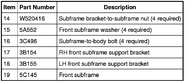 16. Remove and discard the 4 subframe bracket-to-body bolts, the 2 subframe bracket-to-subframe nuts and lower the rear of the subframe.