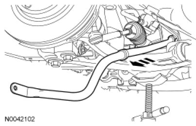 22. NOTICE: Before tightening the stabilizer bar bracket nuts, the suspension must be at the bushing fastener tightening position. Use a suitable jack to raise the suspension until the distance between the center of the hub and the lip of the fender is equal to 402 mm (15.83 in). This will prevent incorrect clamp load and bushing damage.