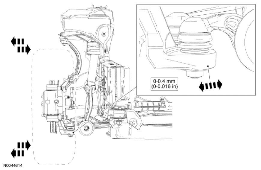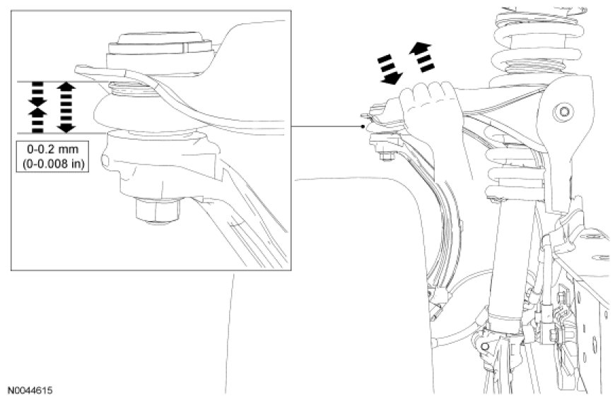 4. NOTICE: Do not use any tools or equipment to move the wheel and tire assembly or suspension components while checking for relative movement. Suspension damage may occur. The use of tools or equipment will also create relative movement that may not exist when using hand force. Relative movement must be measured using hand force only.