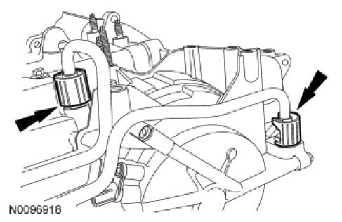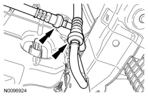 2. Install the transmission fluid cooler tubes in the transaxle by inserting the tube into the fitting until a click is heard/felt. Pull back to confirm connection is secure and position them in the retainer mounted on the main control cover studbolts.