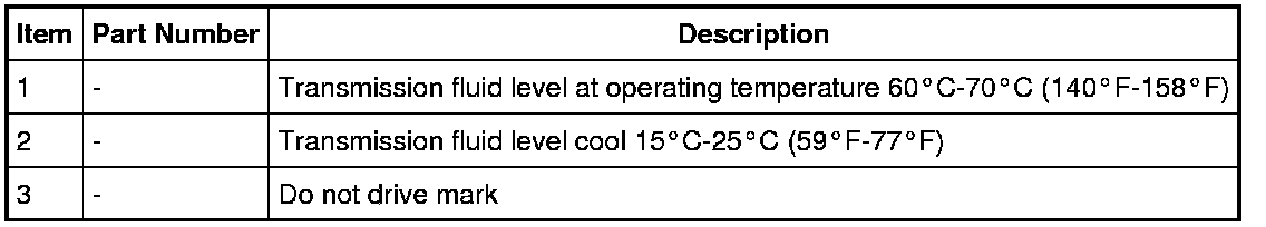 NOTE: The transmission fluid should be checked at normal operating temperature 60°C-70°C (140°F-158°F) on a level surface. Normal operating temperature can be reached after approximately 32 km (20 mi) of driving and can be checked using the scan tool.