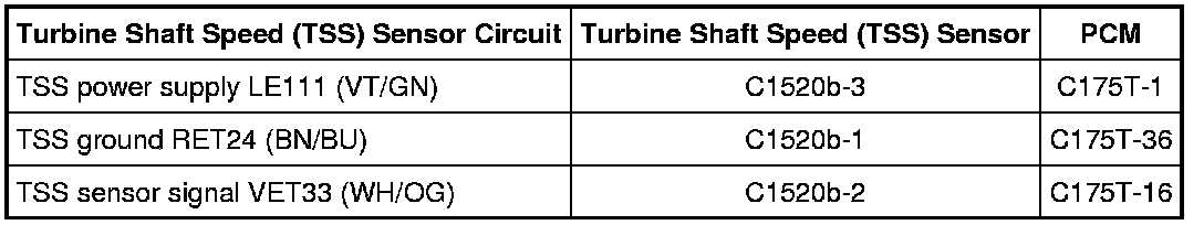 NOTE: Turbine Shaft Speed (TSS) codes may be a result of bad power and ground circuits shared between the Transmission Range (TR) sensor, Output Shaft Speed (OSS) sensor and TSS sensor.