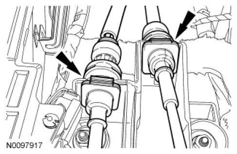 10. NOTICE: Carefully disconnect the gearshift cables from the gearshift lever base. Do not damage the gearshift cable retainers.