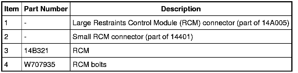 1. WARNING: Always tighten the fasteners of the restraints control module (RCM) and impact sensor (if equipped) to the specified torque. Failure to do so may result in incorrect restraint system operation, which increases the risk of personal injury or death in a crash.