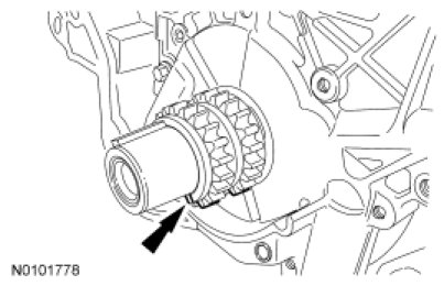 Install the crankshaft sprocket with the timing mark facing out. The timing mark on the LH and RH timing chains will be aligned to this mark during assembly.