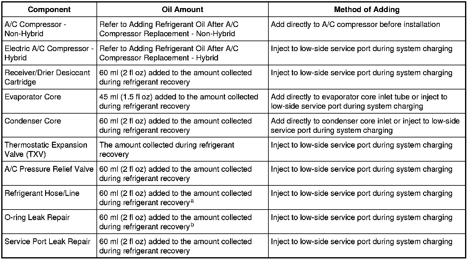 b The amount specified may be used for one or multiple O-ring leak repairs. Do not multiply the refrigerant oil amount by the number of O-ring leaks being repaired.