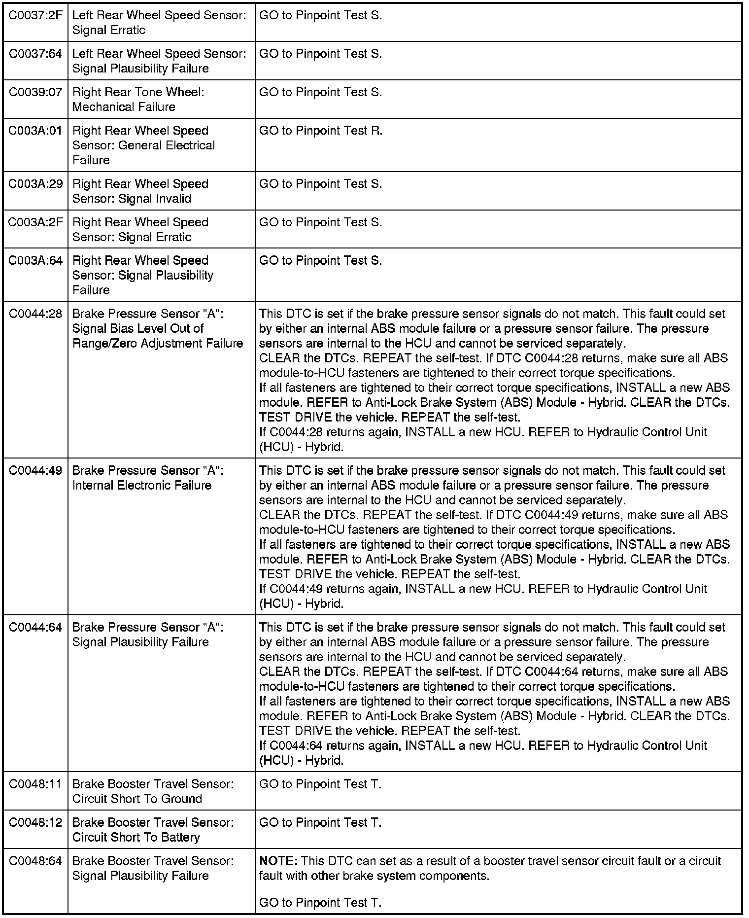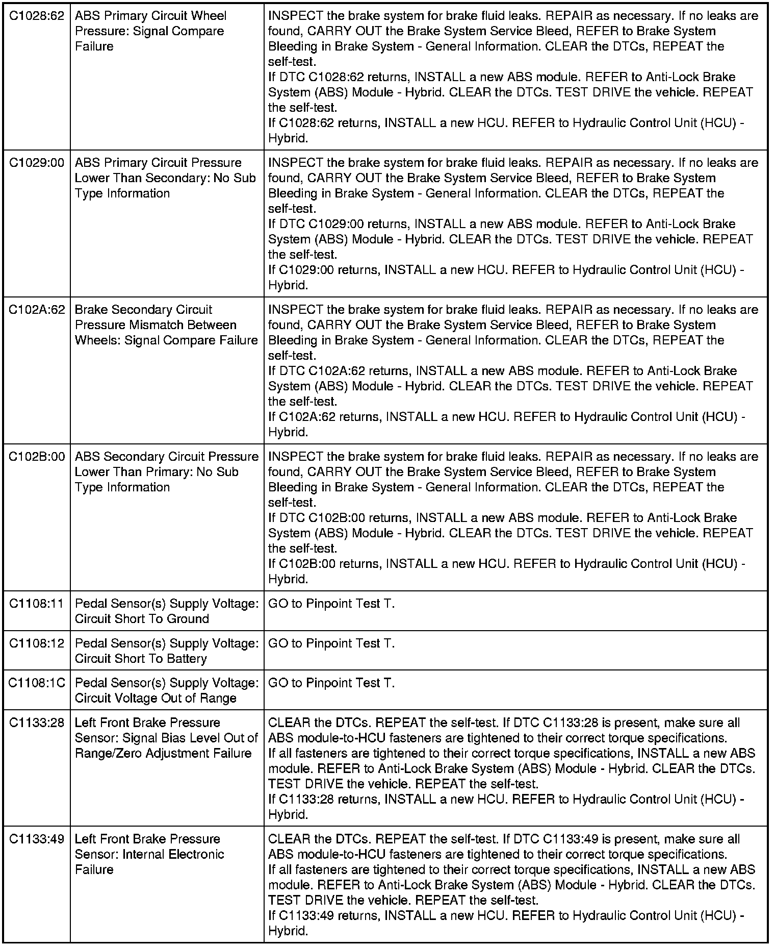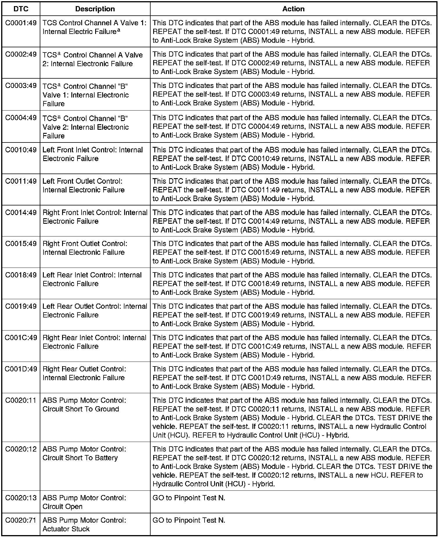 NOTE: This DTC chart applies to hybrid vehicles only. For non-hybrid vehicle DTCs, refer to the ABS Module DTC Chart in Anti-Lock Control - Non-Hybrid.