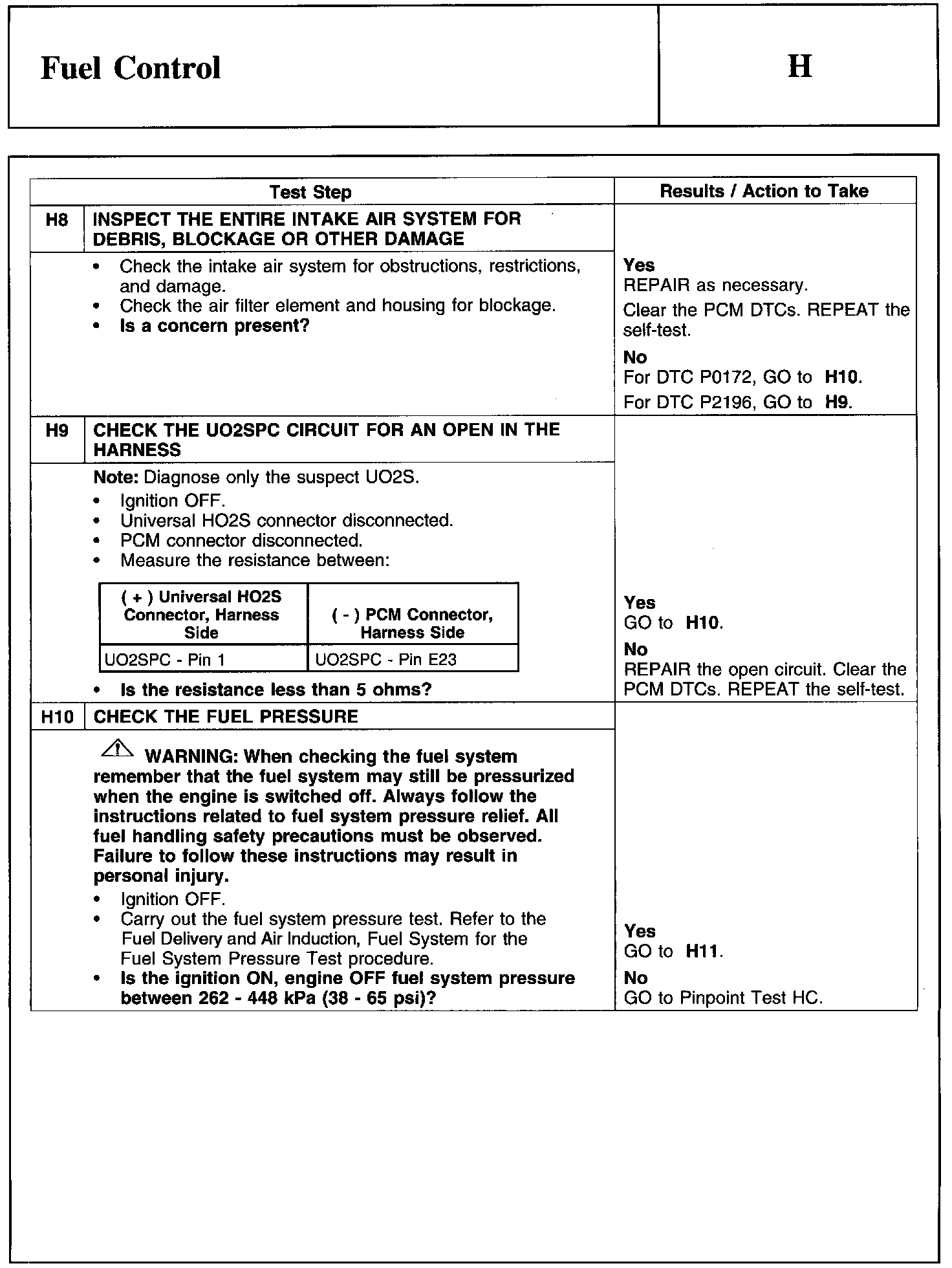 PINPOINT TEST H: FUEL CONTROLWarnings And Heated Oxygen Sensor (HO2S) Connector: