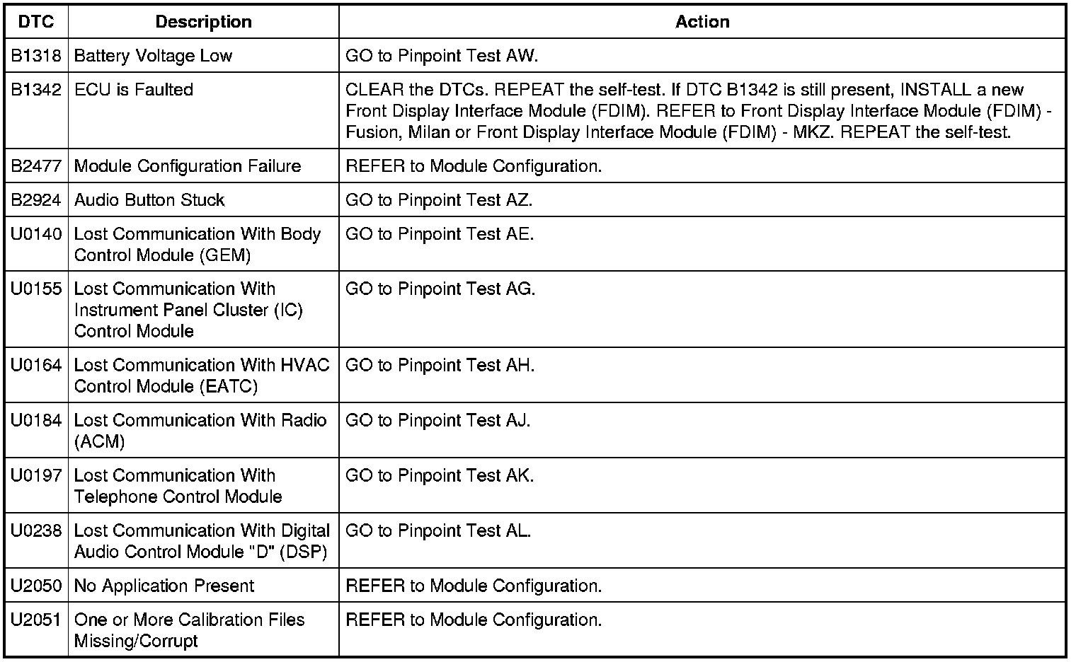 Front Display Interface Module (FDIM) DTC Chart - Vehicles Without Navigation