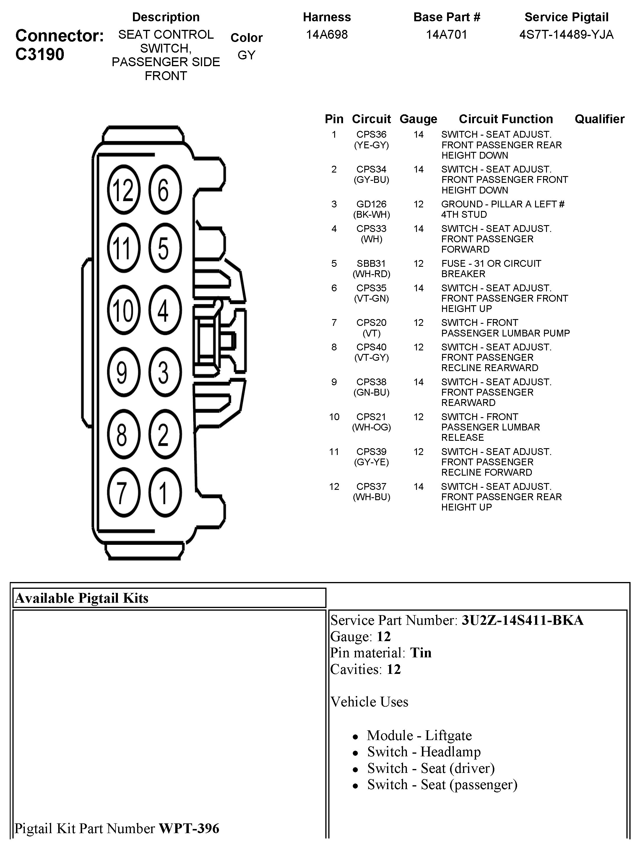 C3190 Seat Control Switch, Passenger Side Front