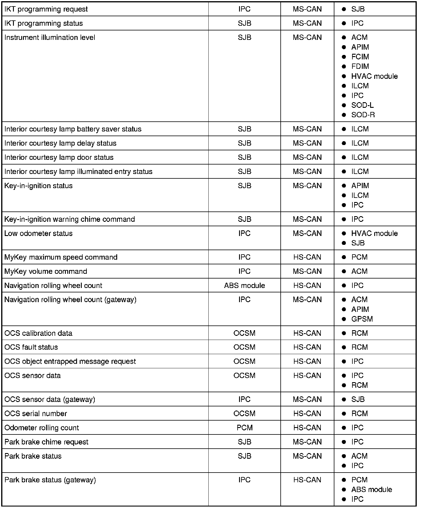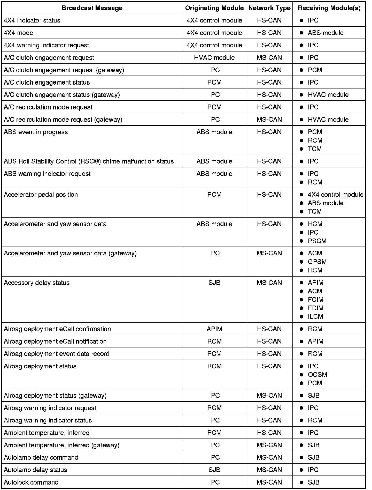 NOTE: This chart describes the specific HS-CAN and MS-CAN messages broadcast by each module, and the module(s) that receive the message.