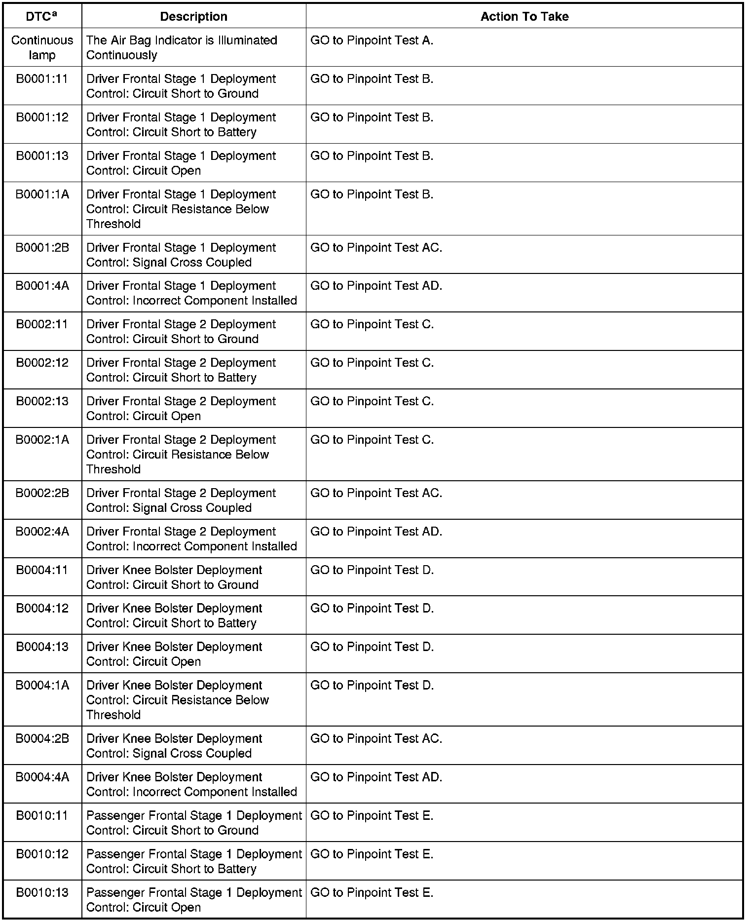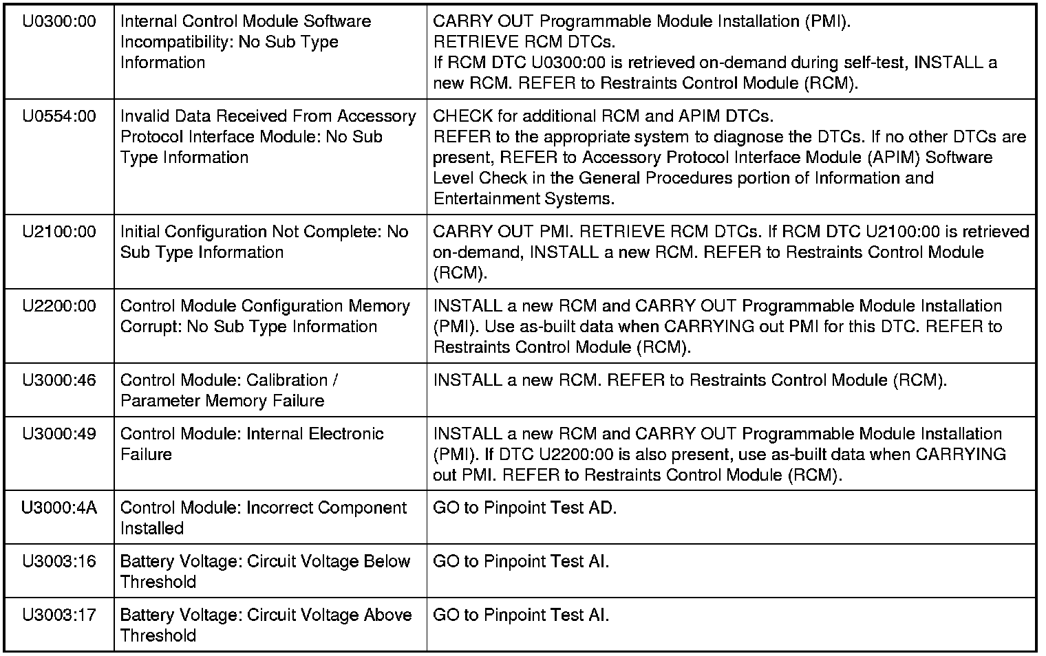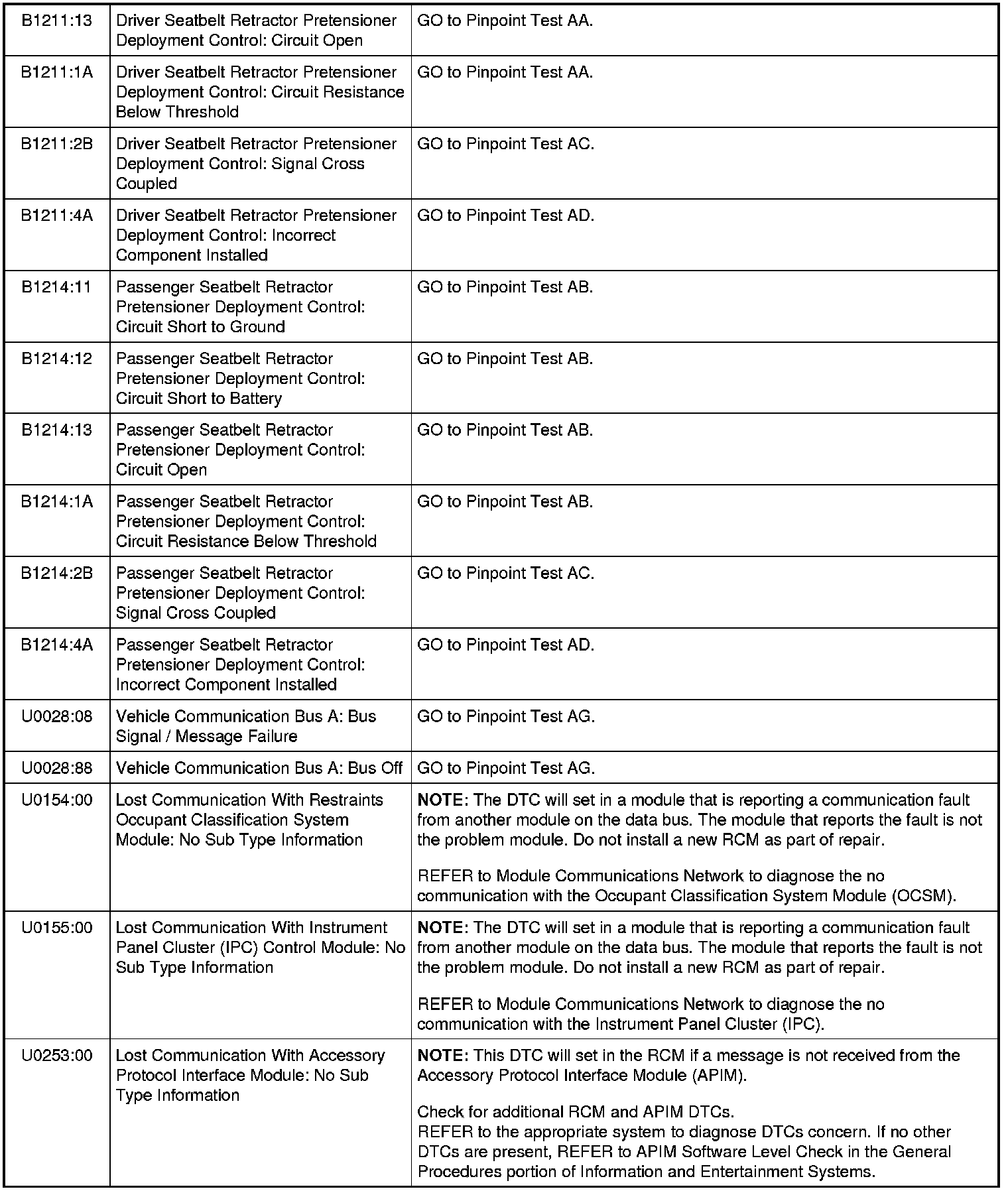 Restraints Control Module (RCM) DTC Chart
