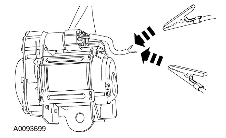9. Deploy the safety belt buckle or retractor by touching the ends of the 2 wires of the jumper harness to the terminals of a 12-volt battery.