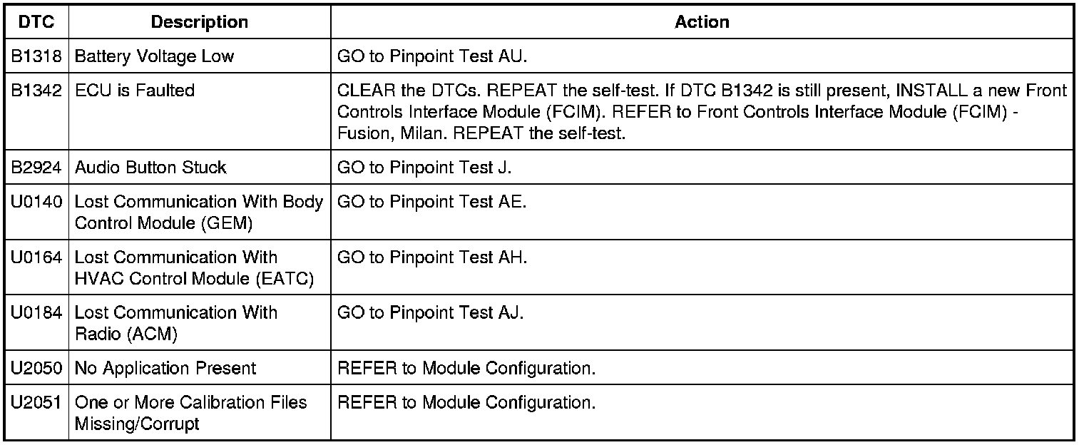 Front Controls Interface Module (FCIM) DTC Chart - Fusion, Milan Without Navigation