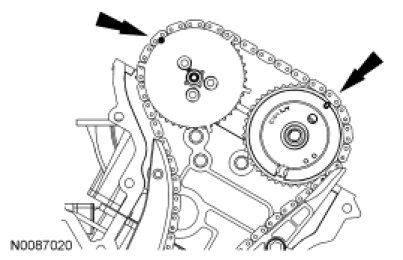 - Align the marks on the timing chain with the marks on the camshaft and crankshaft sprockets.