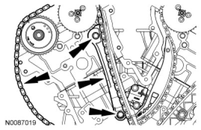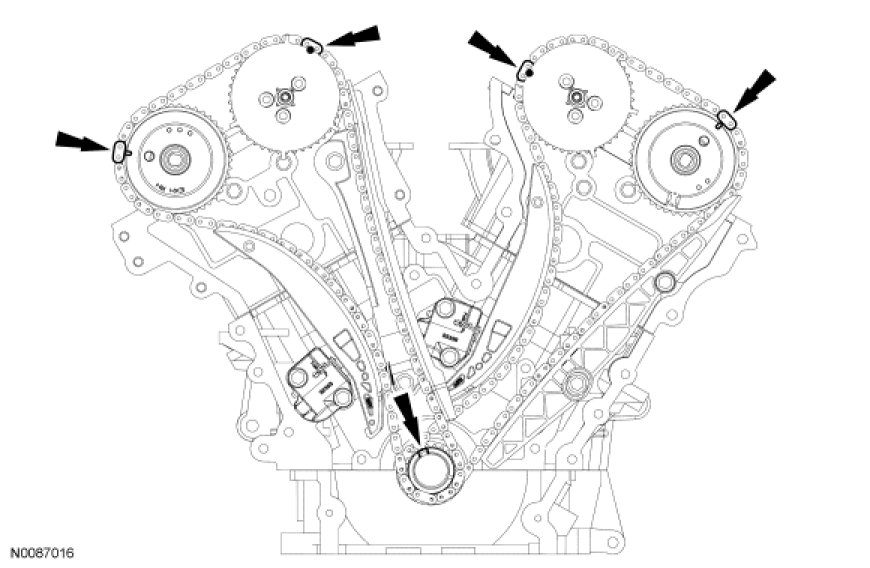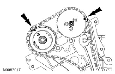 6. If timing marks in the timing chains are not evident, use a permanent-type marker to mark the crankshaft and camshaft timing marks on the LH and RH timing chains.