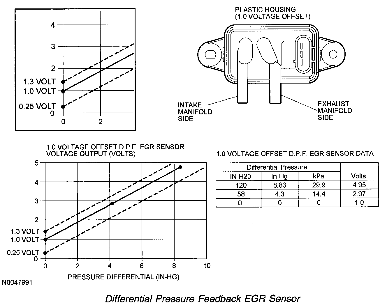 The differential pressure feedback EGR sensor is a piezo resistive type pressure transducer that monitors the differential pressure across a metering orifice located in the orifice tube assembly. The differential pressure feedback EGR sensor receives this signal through 2 hoses referred to as the downstream pressure hose (REF signal) and upstream pressure hose (HI signal). The HI and REF hose connections are marked on the differential pressure feedback EGR sensor housing for identification (note the HI signal uses a larger diameter hose). The differential pressure feedback EGR sensor outputs a voltage proportional to the pressure drop across the metering orifice and supplies it to the PCM as EGR flow rate feedback.