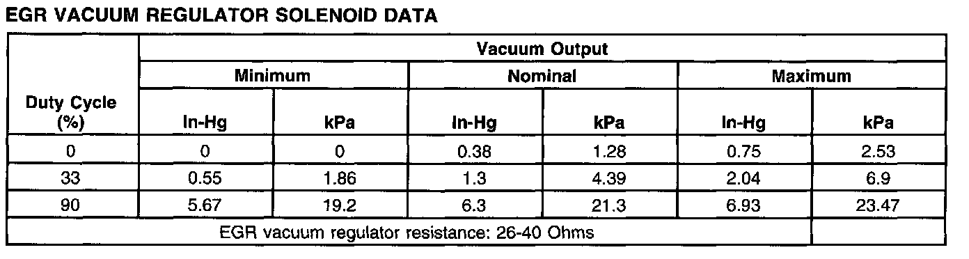 The EGR vacuum regulator solenoid is an electromagnetic device used to regulate the vacuum supply to the EGR valve. The solenoid contains a coil which magnetically controls the position of a disc to regulate the vacuum. As the duty cycle to the coil increases, the vacuum signal passed through the solenoid to the EGR valve also increases. Vacuum not directed to the EGR valve is vented through the solenoid vent to the atmosphere. At 0% duty cycle (no electrical signal applied), the EGR vacuum regulator solenoid allows some vacuum to pass, but not enough to open the EGR valve.