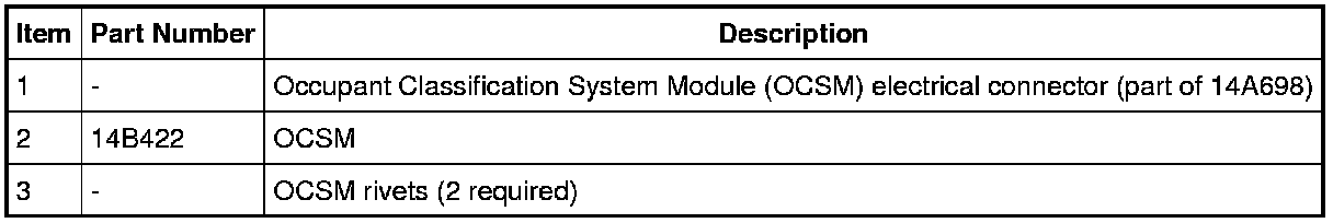 5. If installing a new OCSM, carry out the system reset procedure. For additional information, refer to Occupant Classification Sensor (OCS) System Reset Programming and Relearning in the General Procedures.