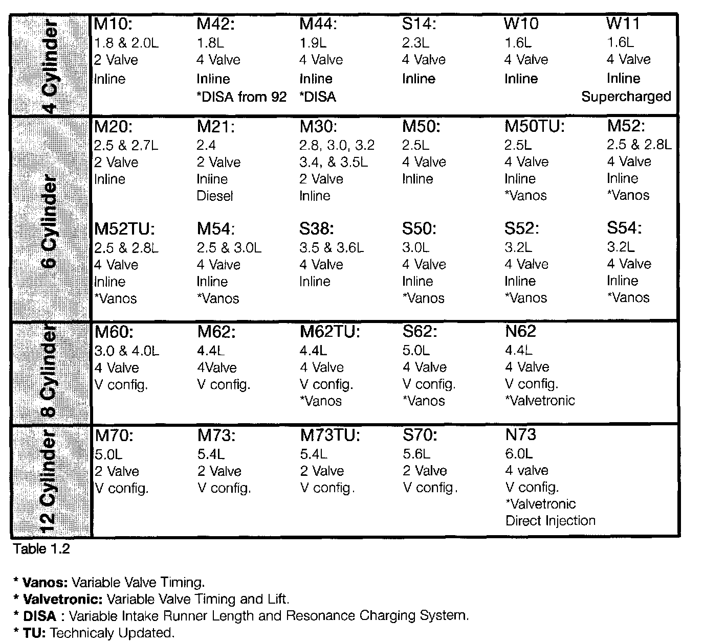After the letter there are two digits that identify the engine. Table 1.2 below lists engines by number of cylinders. Please refer to the BMW Technical Information Card for individual model application.